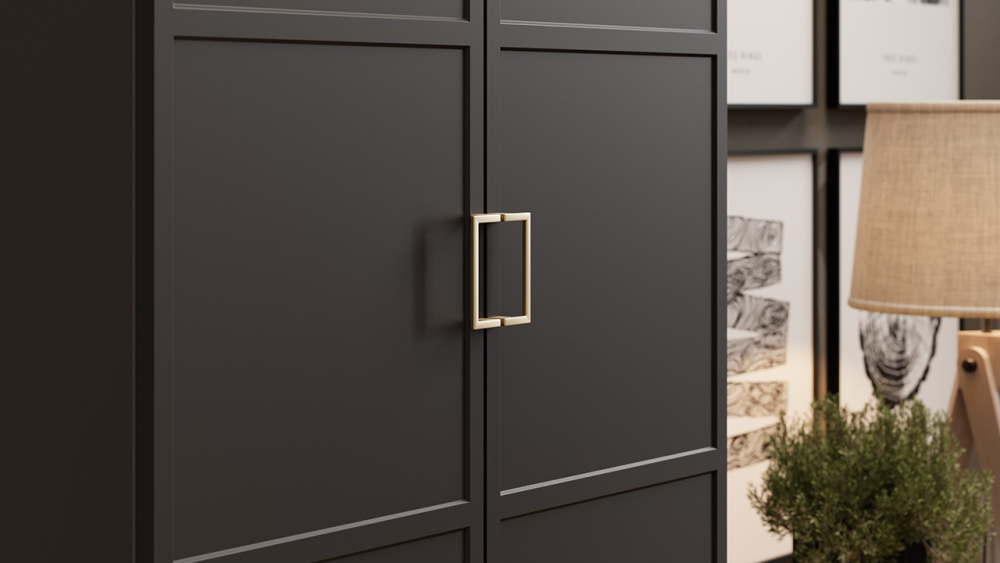 • Фурнитура. Лицевая фурнитура спальни Стелла - дизайнерские металлические ручки с эффектом браширования, который имитирует состаренное золото. Они обладают четкой и геометрической формой, а располагаясь рядом друг с другом создают форму квадрата.