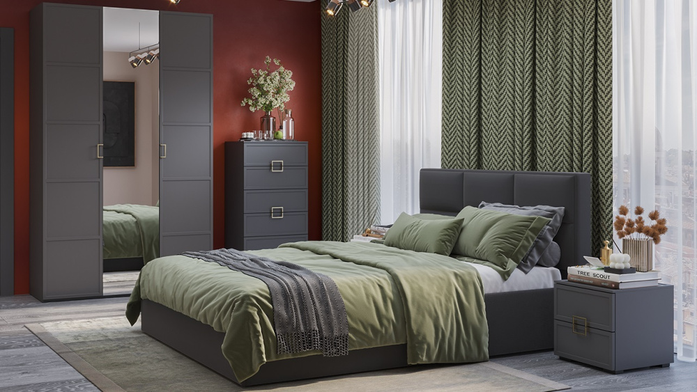 • Декор. Отсутствие пестрых расцветок и организация небольшого контраста, в виде сочетания фасадов с золотыми металлическими ручками, помогают создать гармоничный и современный образ спальни, который будет сочетаться с любым интерьером. Важной особенностью набора является геометрическая фрезеровка на фасадах и крышках тумб, комодов, где визуальный объем и глубину рисунка подчеркивает матовая структура, которая отлично сочетается с однотонными декорами. Такая обработка прекрасно дополнит образ коллекции, превращая её в единое целое.