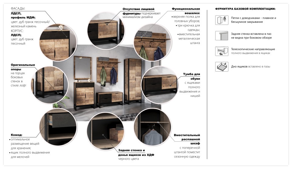 Стильная и лаконичная прихожая Стокгольм выполнена в стиле лофт. Особенность дизайна – это сочетание реалистичных по цвету и тактильности трендовых декоров, которые соответствуют последним городским тенденциям. «Дуб Гранж» привлекает песочным оттенком и имитацией вручную обработанного дерева с выразительной зернистой текстурой, характерной формой досок. Стильный серый цвет «Железного камня» с металлическими разводами и новая текстура состаренной штукатурки в сочетании с гладкостью металла вносят индустриальный колорит. Оригинальные ножки-опоры из контрастного профиля МДФ, расположенные по бокам модулей, имитируют металл и подчеркивают стиль коллекции.