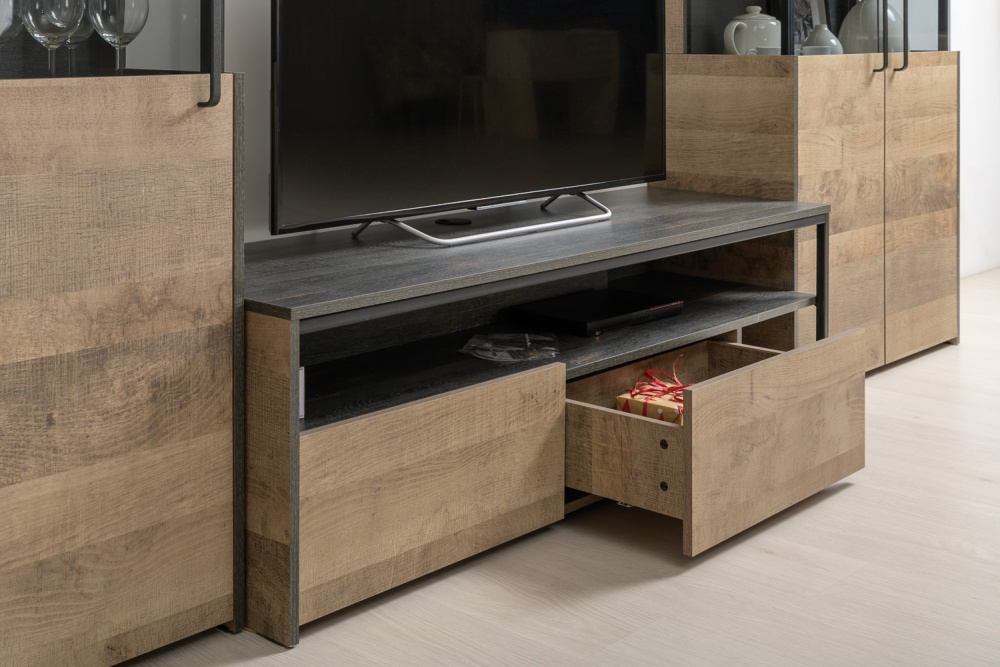 Лицевая фурнитура с тем же покрытием придаёт мебели индустриальную эстетику.