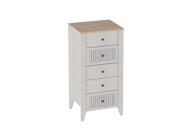 Комод с 5 ящиками Валенсия выполнен из (ЛДСП) в комбинации Дуб натуральный светлый / Персидский жемчуг.