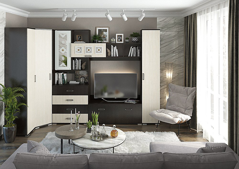 Стильная и современная гостиная Яна порадует Вас своей функциональностью и интересным сочетанием расцветки. Индивидуальность придают оригинальные зеркальные вставки на дверцах. Подойдет для установки телевизора, имеет открытые ниши для фотографий и сувениров, закрытые и открытые полки, выдвижные ящики для хранения вещей.