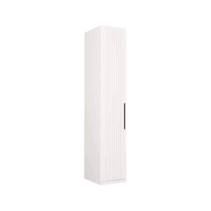 Распашной шкаф Валенсия оснащен несколькими удобными полками для хранения сложенной одежды, коробок с обувью или сезонных аксессуаров. Вертикальная фрезеровка в сочетании с контрастной ручкой делают модель особенно стильной и привлекательной.