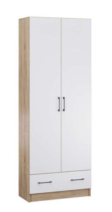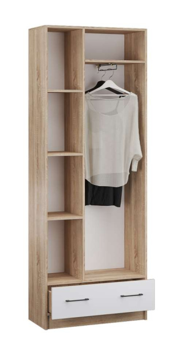 Не глубокий двухдверный шкаф Денвер оснащен выдвижным ящиком, полками и выдвижной евро-штангой.