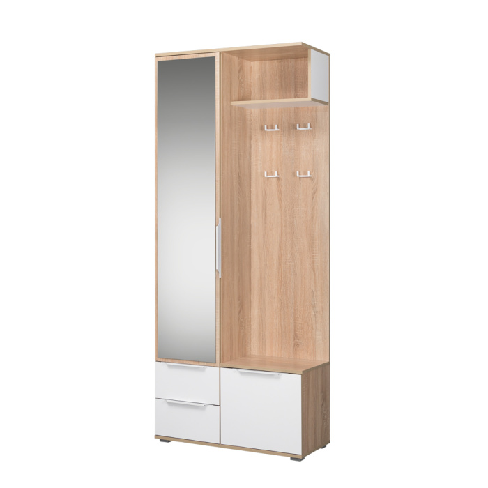 Шкаф комбинированный Куба отлично подойдет для меблировки стильной и компактной комнаты. Модель включает в себя закрытые и открытые полки для обуви и аксессуаров, а также открытую вешалку с полкой для головных уборов и выдвижные ящики для разных мелочей.