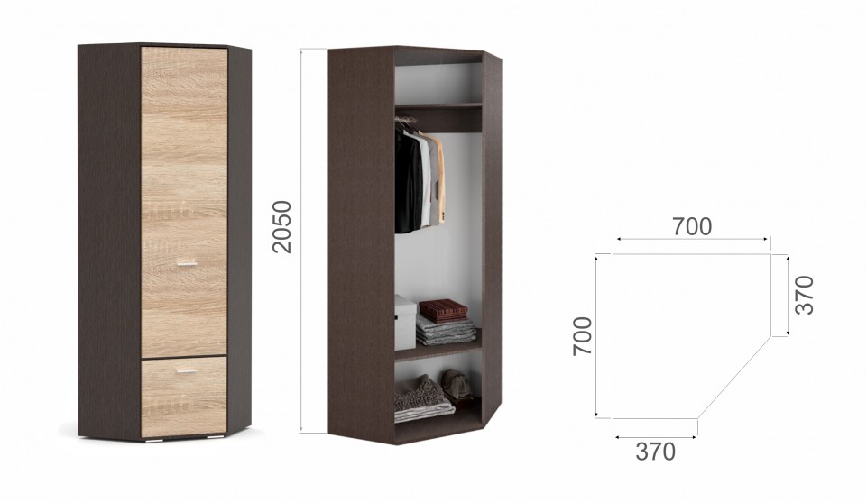 Шкаф позволяет рационально использовать пространство и будет хорошо смотреться даже в небольшой комнате, служит связующим звеном для составления угловой системы хранения. Нейтральные цвета корпуса и фасадов всегда будут актуальны, создают особый комфорт и уют. Внутри предусмотрены полки для белья и отделение с металлической овальной штангой. Идеально компонуется со всеми модулями системы Виола.