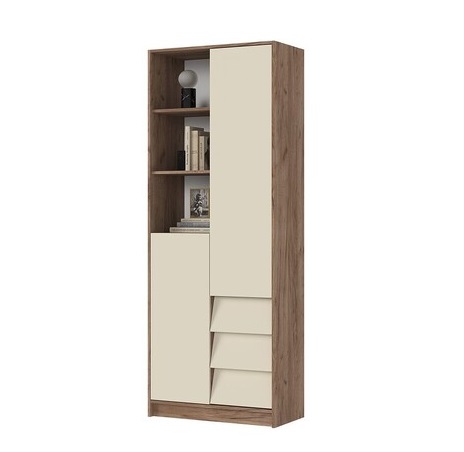 Стильный стеллаж из коллекции Рейн станет отличным акцентным дополнением в интерьере. Практичная внутренняя компоновка включает: открывающиеся распашные дверцы, за которыми скрываются: 4 вместильных полки, которые подойдут для сложенной одежды или коробок. Три выдвижных ящика на направляющих полного выдвижения подойдут для хранения белья или мелких предметов.