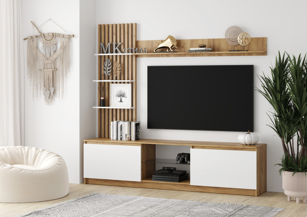 Небольшая по габаритам и элегантная стенка Бостон будет прекрасно смотреться в интерьере вашей гостиной. Функциональность в сочетании с изящным видом – главное достоинство стенки. В ее конструкции предусмотрено три открытых полки, ниша со стеклополкой, а также два объемных выдвижных ящика с повышенной грузоподьемностью.