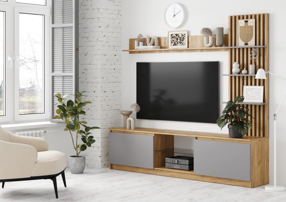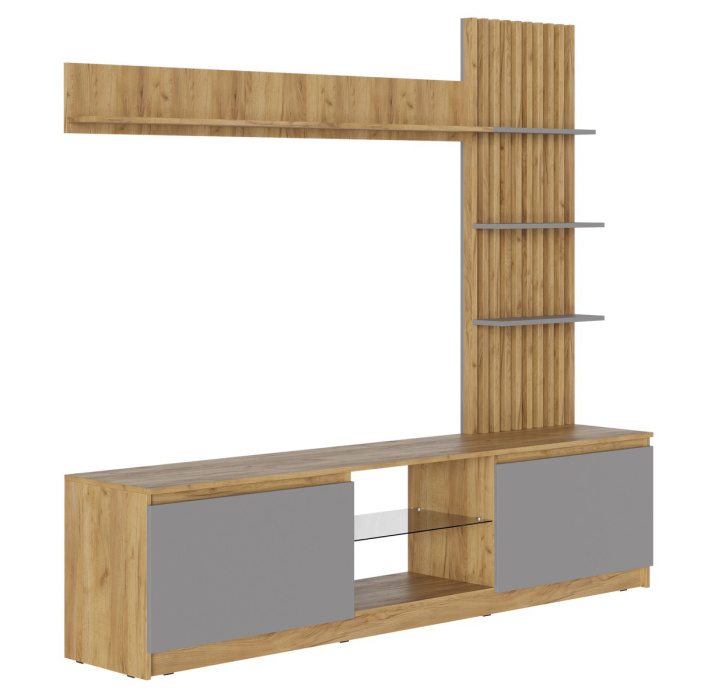 • Фасады стенки могут быть выполнены на выбор из МДФ или из ЛДСП. От выбранного материала зависит цветовое решение: МДФ-части имеют белый цвет, ЛДСП-части окрашены в серый
