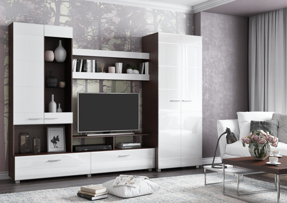 • Полка под ТВ опирается на перегородку напольной тумбы, что позволяет избежать прогиба полки под весом телевизора