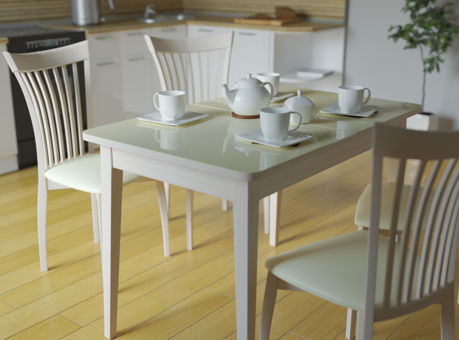 При изготовлении стола Kenner 1100С использовано глянцевое флоат-стекло Optiwhite с осветленной структурой. Его особенностью является отсутствие в спектре «бутылочных» оттенков и способность к высокой цветопередаче без искажения чистоты тона. Детали подстолья выполнены из массива бука и тонированы в белый цвет, что придает изделию черты легкости и воздушности, а также визуально расширяет пространство.