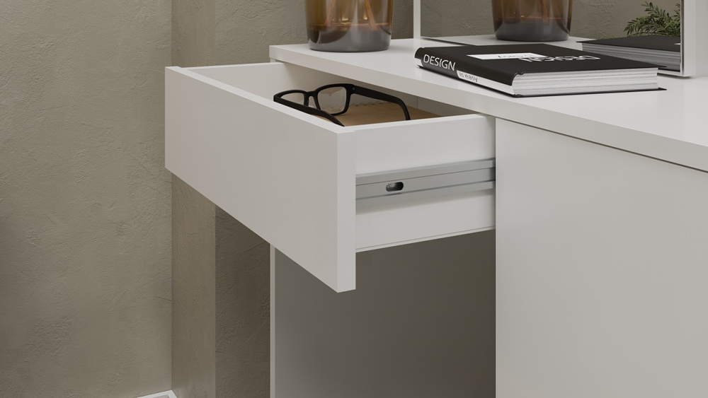 Функциональность. Помимо внешней привлекательности стол имеет большое зеркало, за которым размещены скрытые полки для хранения всех необходимых аксессуаров и косметики. Наличие открытых полок позволит установить предметы декора, а практичный выдвижной ящик и секция за распашной дверцей добавит места для необходимых мелочей. В этом туалетном столике нет ничего лишнего, только самое необходимое для уголка женской красоты.