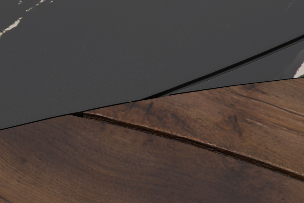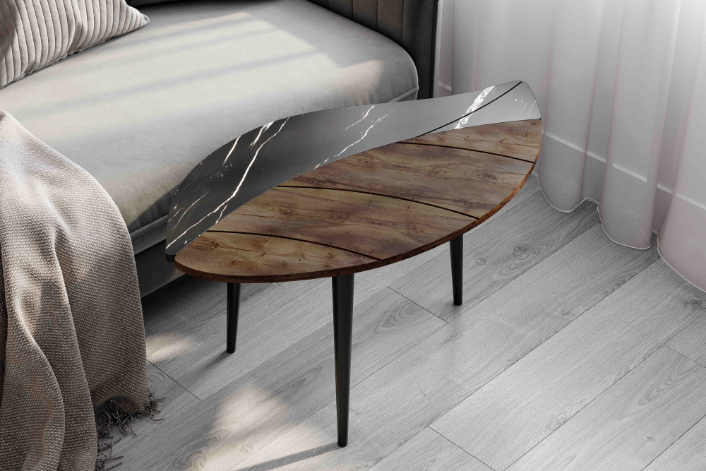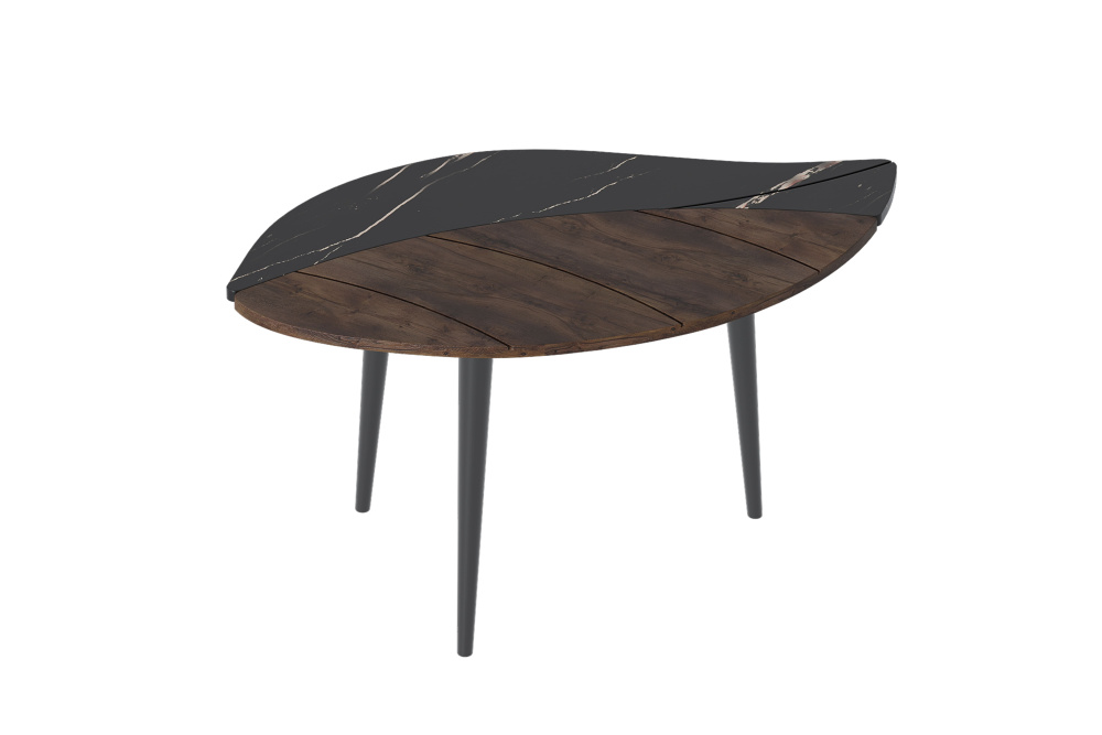Особенностью дизайнерского решения журнального стола №17 является оригинальное сочетание фигурных элементов столешницы в форме листа дерева. Опоры выполнены из дерева.