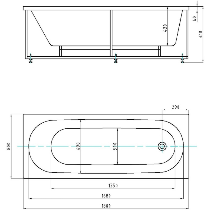 Ванна акриловая Aquatek "Оберон 180Х80" без гидромассажа
