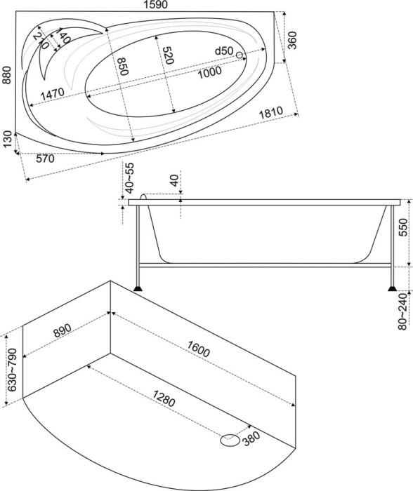 Комплектация ванны: ванна + каркас + слив-перелив.