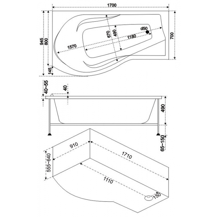 Угловая ассиметричная ванна может быть как вправо, так и в левостороннем исполнении.Несмотря на то, что ванна угловая она имеет прямоугольное ложе закругленное и немного вытянутое с одной стороны, которое заканчивается подголовником. Внутри купели размещаются подлокотники для более удобного расположения рук. Армирующий слой - укрепляет корпус ванны.
