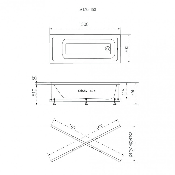 • Материал ванны — Акрил • Брэнд — Triton • Длина мм. — 1500 • Ширина мм — 700 • Высота мм. — 560 • Страна производитель — Россия Объем л. 160
