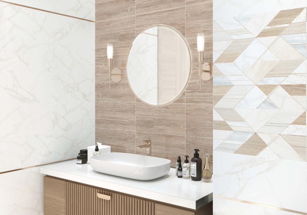 Глянцевая поверхность имеет рисунок под дерево. Эта плитка применяется для облицовки стен внутренних помещений: ванной, туалета.