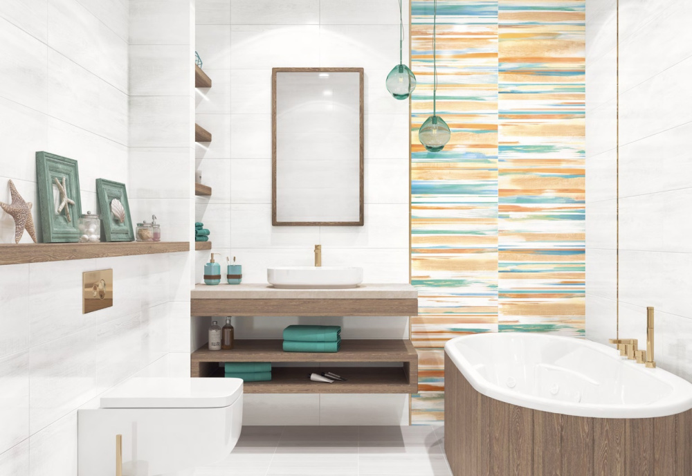 Глянцевая поверхность имеет рисунок под дерево. Эта плитка применяется для облицовки стен внутренних помещений: ванной, туалета.
