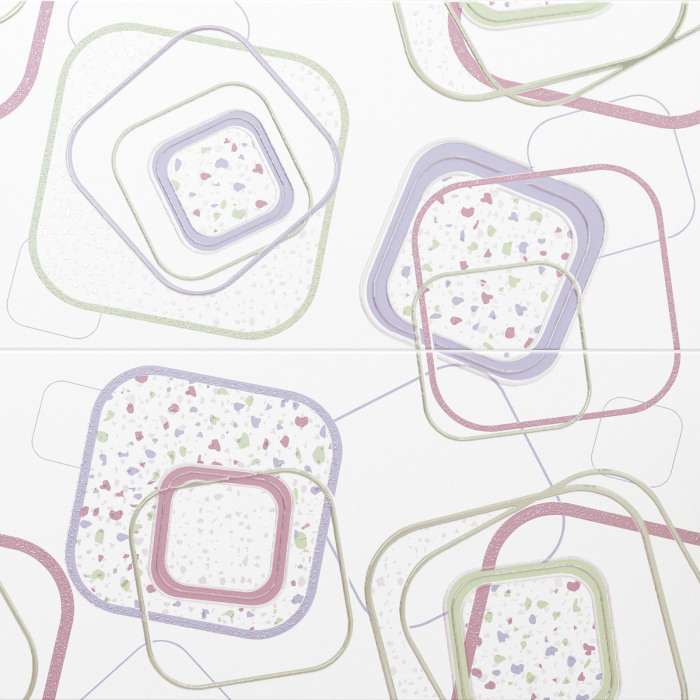 Светлая жизнерадостная коллекция Candy с матовой керамической плиткой в белом, светло-зеленом и светло-розовом цветах комбинируется с плиткой под разноцветный терраццо и декоративным панно с объемными перламутровыми фигурами. Прекрасным дополнением станут бордюры-стики, которые завершат образ вашего интерьера. Данная коллекция позволит создать неповторимый интерьер в современном стиле.