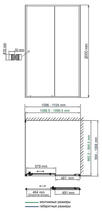• Диапазон регулировки ширины душевого уголка за счет боковых профилей: 1096-1104 мм.