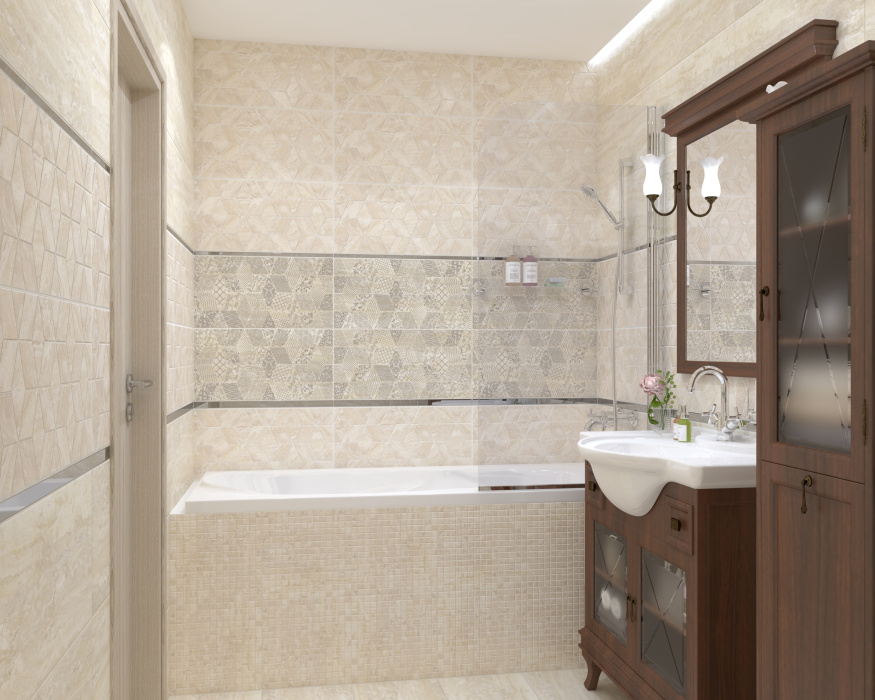 За основу коллекции Echo дизайнеры взяли поверхность травертина. Цифровая печать передала всю глубину цвета и переходы мельчайших оттенков. В серой и бежевой палитре одинаковый набор элементов. Базовая настенная плитка поддерживается рельефной плиткой с мозаикой из ромбов и параллелепипедов. В дополнение к ней идёт декор Bomond с мозаичной поверхностью в стиле пэчворк, где в каждой фигуре изображён орнамент с контрастными линиями. Модуль Elemental покрывают металлизированные квадратные элементы. Псевдомозаика пригодится для облицовывания выступов, ниш и зонирования ванной комнаты. Область применения: для ванной, душа, туалета и кухни.