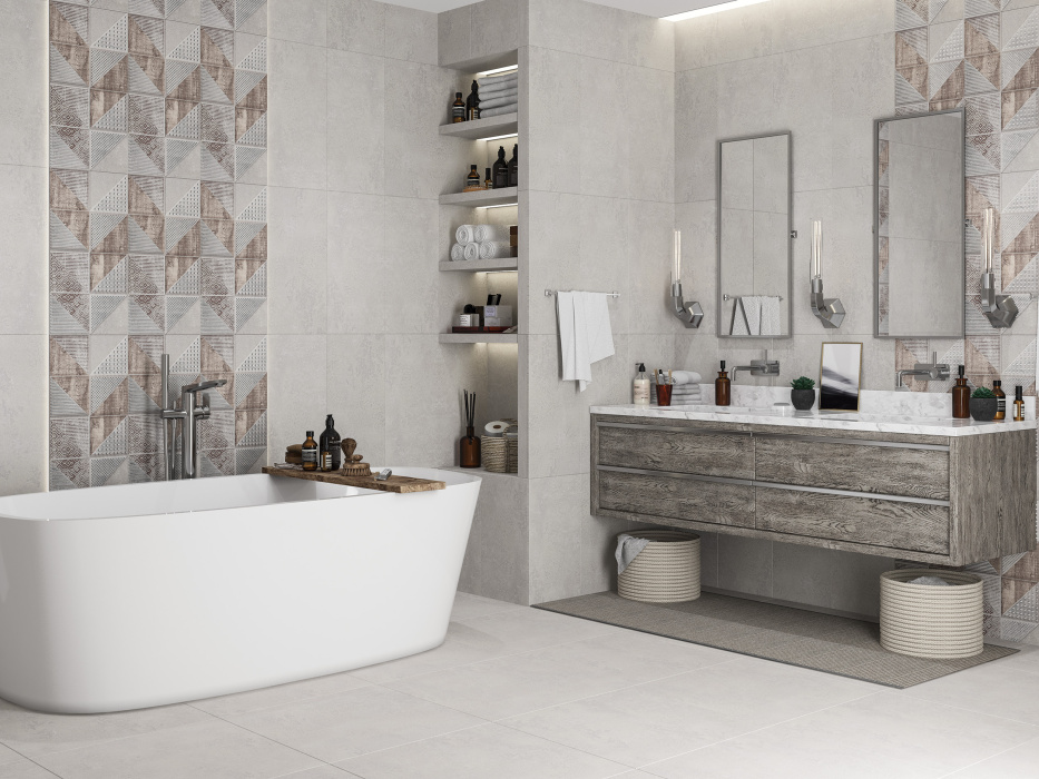 Выразительный объем геометрической декоративной плиты создается с помощью эффекта гранилья (сахароза), нанесенная цифровым способом. В итоге базовая плита воспринимается как декоративный элемент, что позволяет зонировать пространство в интерьере.