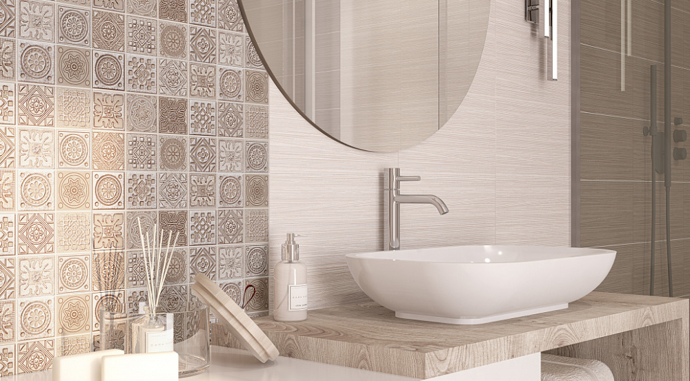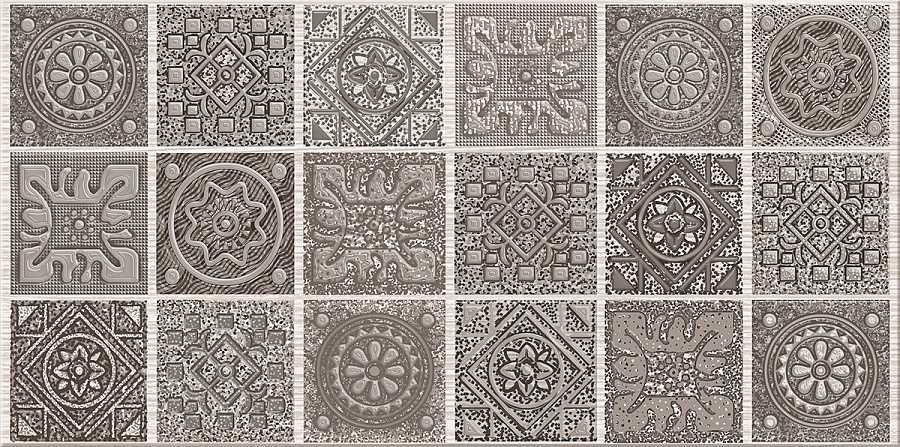 GRAZIA - цвет темных плит: Grey и Mocca, орнаментальность декора по типу мозаика - формируют лаконичность данной коллекции. Она сдержана, графика плиты проста: полоска с тактильно приятной поверхностью. Декоративный элемент мозаичного крупного орнамента, напоминающий изразцовые плитки, органично сочетает в себе глянцевую и матовую поверхность, выполнен традиционным способом с использованием ветрозы–гэлакси.