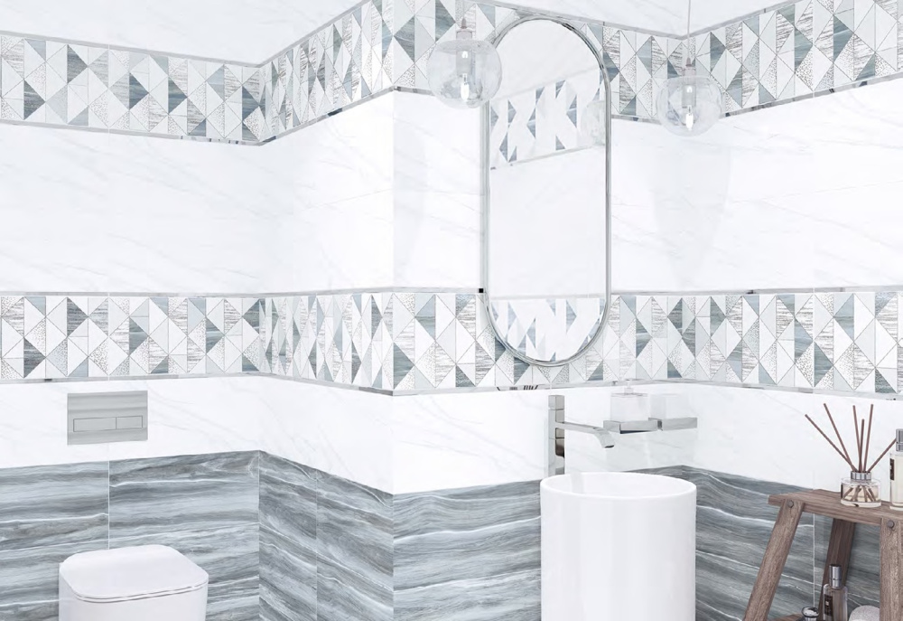 Глянцевая поверхность имеет рисунок под камень. Эта плитка применяется для облицовки стен внутренних помещений: ванной, туалета