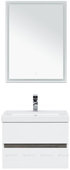 Мебель для ванной Aquanet Беркли 60 белый/дуб рошелье (зеркало белое) имеет изюминку - контрастную декоративную полосу между ящиками в цвете «дуб рошелье». Корпус и фасады тумбы выполнены из влагостойкого ЛДСП и покрыты глянцевой белой эмалью. В конструкции тумбы использованы интегрированные ручки без острых краев и внутренних углов.