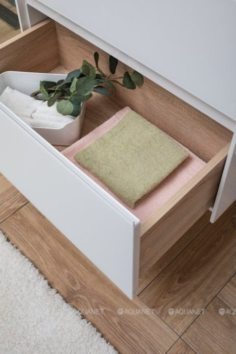 Производители позаботились о деталях. Ящики лишены выступающих деталей, ручки интегрированы в фасад. Тумбу можно из подвесного элемента преобразовать в напольный, просто докупив универсальные ножки. Раковина из литьевого мрамора «Орлеан» относится к числу накладных моделей и внешне выглядит как единое целое с тумбой. Ящики тумб оснащены направляющими Hettich Quadro c плавным закрыванием, более известным нам как доводчик.