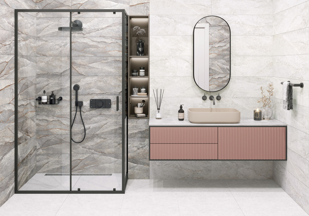 Матовая поверхность имеет рисунок под камень. Эта плитка применяется для облицовки стен внутренних помещений: ванной, туалета.