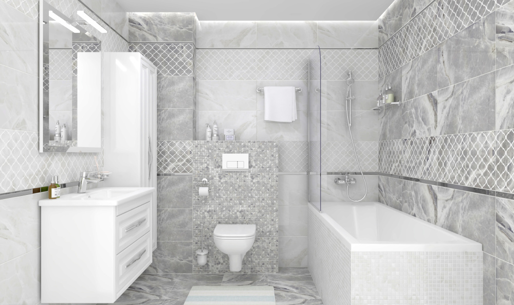 Базовая настенная плитка Plazma от Laparet предложена в гамме из белых, серых и зеленых оттенков. Мраморная структура имеет довольно активный, насыщенный прожилковый рисунок, поэтому крупноформатные модули могут использоваться совсем без декоров и при этом интерьер не будет скучным, но всё же дизайнеры включили в линейку ассортимент декораций.Вставки Avers оформлены орнаментом из треугольников, некоторые из которых проработаны серебристой и золотистой глазурью. Декоры Nuance украшены скромным узором-сеткой с ячейками «арабский четырехлистник».