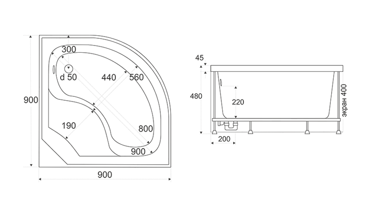 Акриловый поддон, усиленный листом влагостойкого ДСП. Может армироваться как полиэфирной смолой, так и безопасной, экологически чистой полиуретановой пеной высокой плотности, имеет 4 регулируемых ножки.
