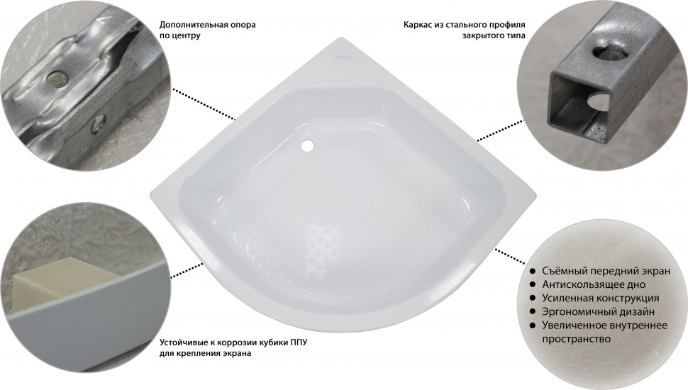 • Форма поддона: Полукруг • Тип поддона: Средний • Сифон душевой кабины: 50 мм