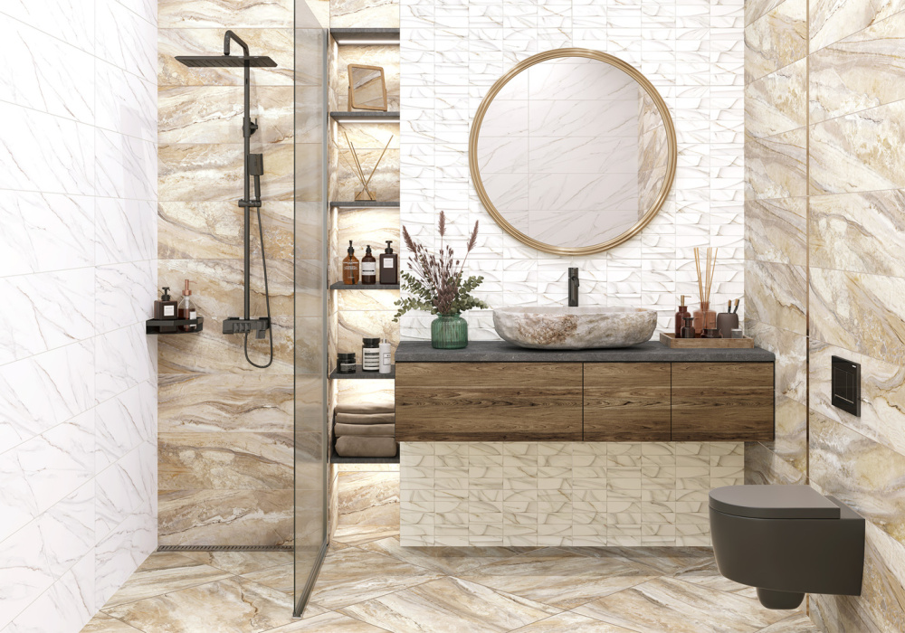 Глянцевая поверхность имеет рисунок под камень. Эта плитка применяется для облицовки стен внутренних помещений: ванной, туалета.