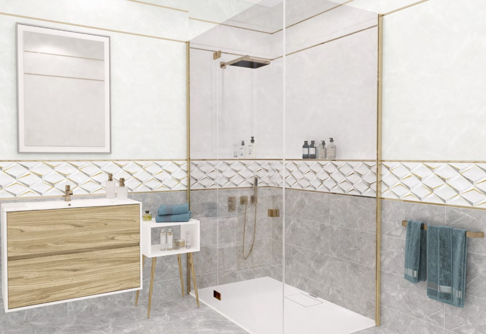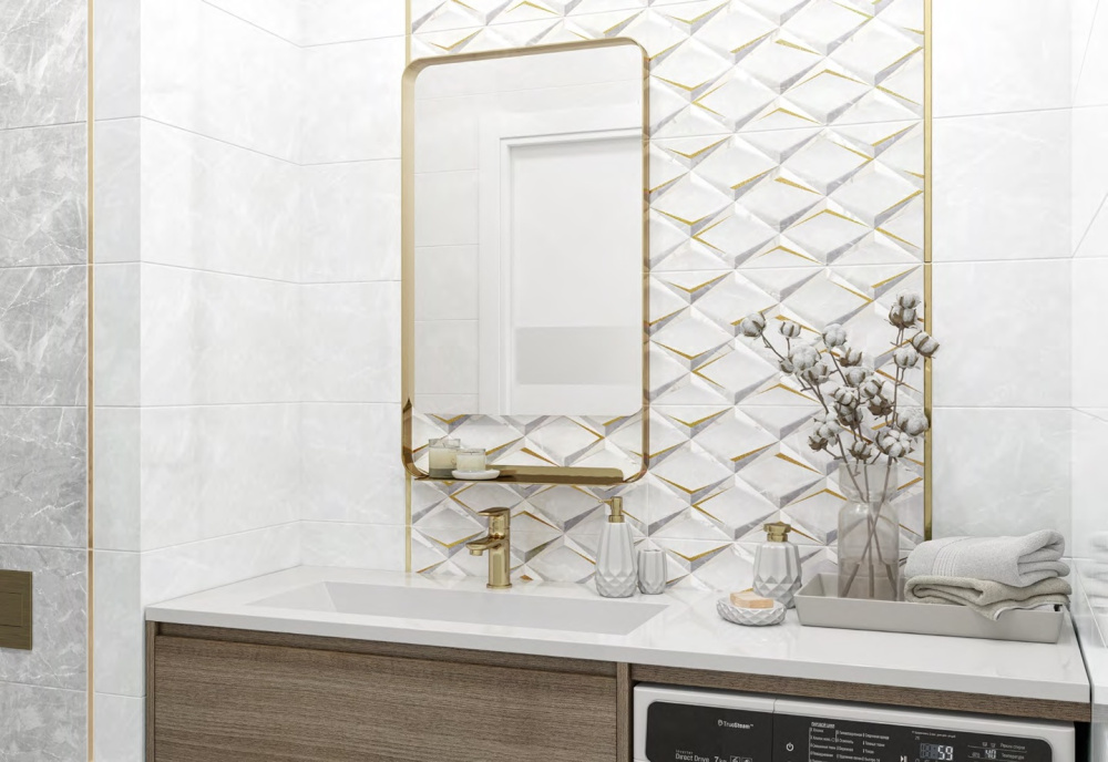 Глянцевая поверхность имеет рисунок под мрамор, с орнаментом, геометрический узор. Эта плитка применяется для декорирования стен внутренних помещений: ванной, туалета.