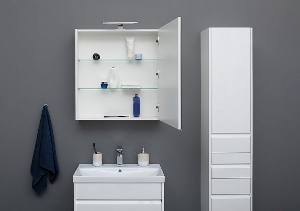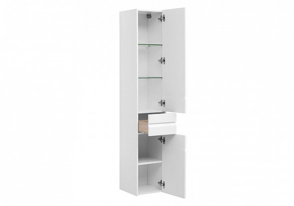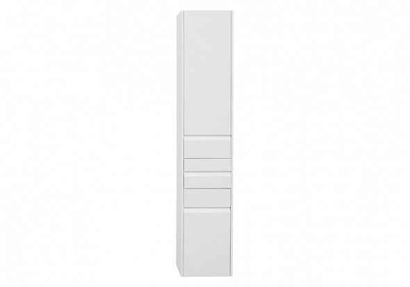 Шкаф-пенал для ванной Aquanet Палермо белого цвета шириной 35 см с корпусом из влагостойкого ЛДСП интересен в первую очередь игрой деталей. Так, полосы глубокой фрезеровки на фасаде - это вовсе не декоративные детали, как может показаться на первый взгляд, а удобные интегрированные ручки - модный мебельный тренд. Пенал разделен на три зоны хранения, соответственно, в нем предусмотрено три таких фрезеровки-ручки. Две из них открывают распашные дверцы, за которыми в общей сложности скрыты пять полок, и одна служит ручкой для расположенного посередине выдвижного ящика. Функционально, просто и красиво. .