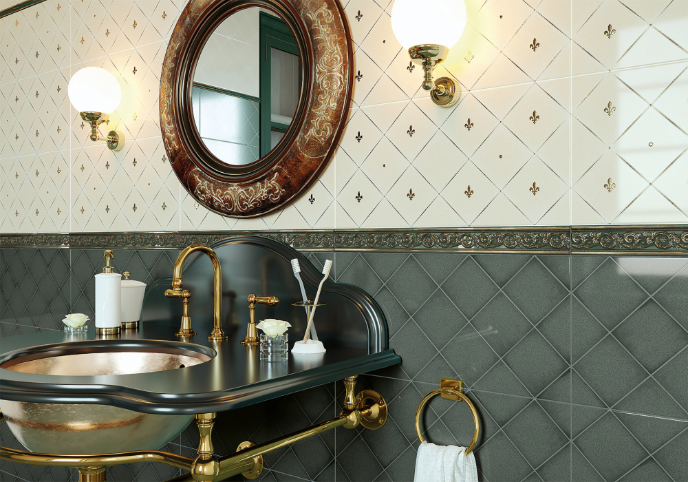 Adele — это строгая и одновременно роскошная коллекция в английском стиле. Глянцевая поверхность, покрытая тонкой паутинкой кракелюра, с легким рельефом в виде ромбов дополнена декором с рисунком «геральдической лилии». А также коллекционный бордюр двух видов, украшенный золотыми вензелями, создаст богатый интерьер в классических благородных цветах.