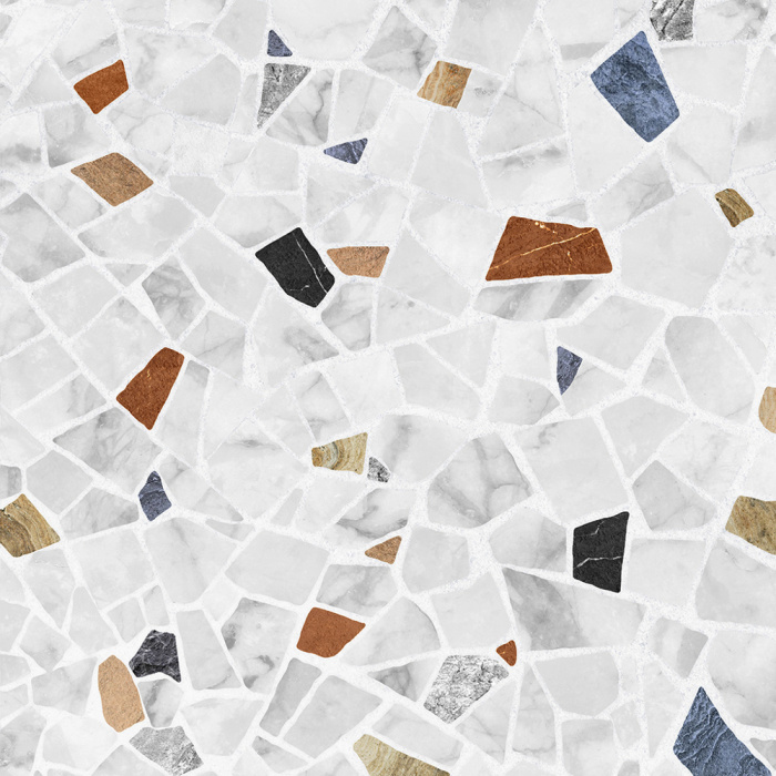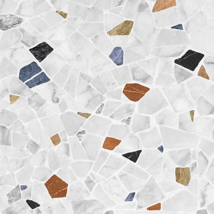 Матовая поверхность имеет рисунок терраццо. Этот напольный керамогранит отлично подойдет для ванной, туалета, коридора, гостиной и других помещений.