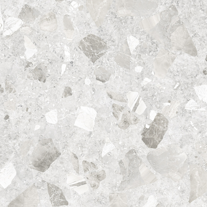 Поверхность имеет рисунок терраццо. Этот напольный керамогранит отлично подойдет для ванной, кухни, туалета, коридора, гостиной и других помещений.