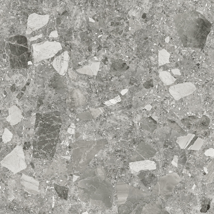 Поверхность имеет рисунок терраццо. Этот напольный керамогранит отлично подойдет для ванной, кухни, туалета, коридора, гостиной и других помещений.