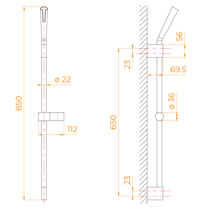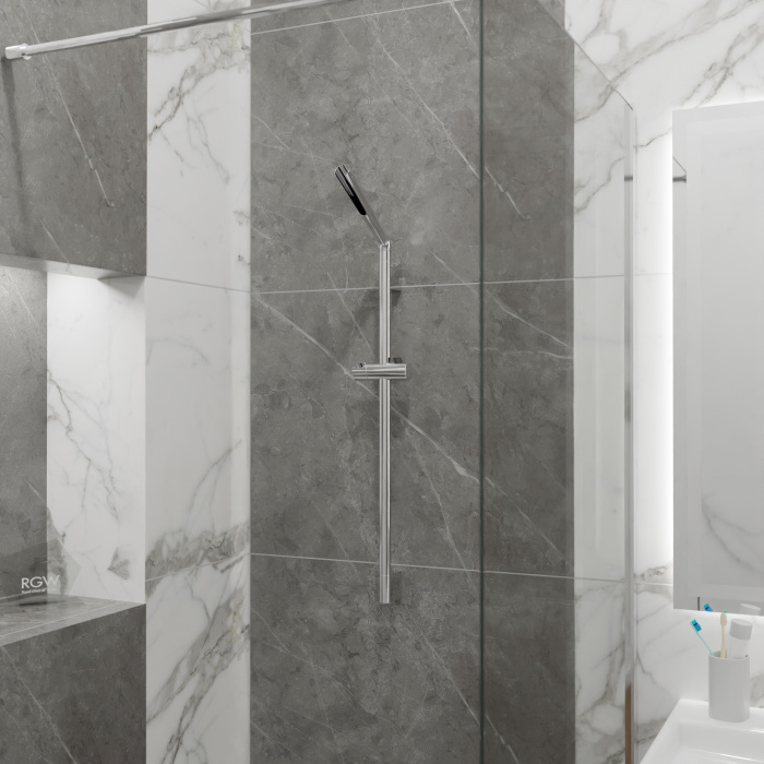 Душевая стойка с регулируемым по высоте держателем ручного душа. Поворотная верхняя часть держателя ручного душа.