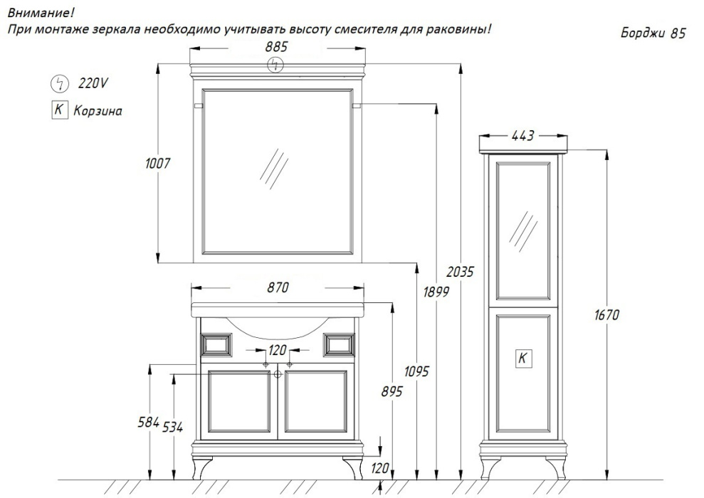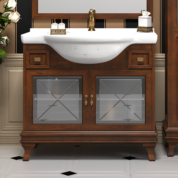 Модель «Борджи» - это современная мебель, выполненная в классическом стиле. Изготовленная из массива дерева и украшенная стеклом с гравировкой, она будет отлично смотреться в любой ванной комнате. Комплект мебели Борджи состоит из зеркала в деревянной раме с подсветкой в козырьке, тумбы с двумя открывными фасадами и двумя небольшими выдвижными ящиками, расположенными в фартуке, и керамической раковины.