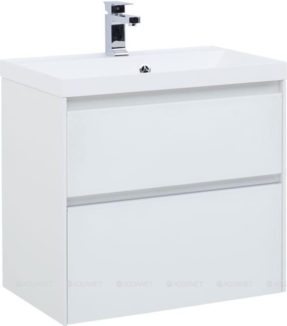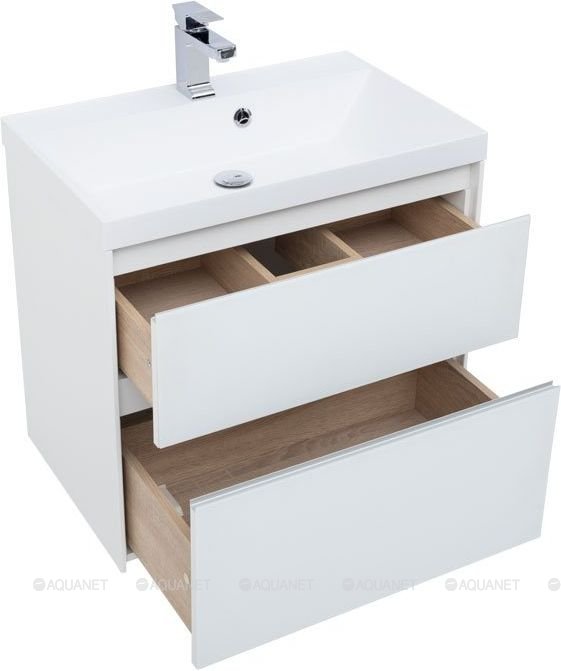 Тумба с раковиной Aquanet Гласс 60 белого цвета смотрится эффектно благодаря сочетанию белого матового стекла на фасаде верхнего выдвижного ящика с белоснежными глянцевыми поверхностями корпуса, выполненного из МДФ. Такое покрытие, к тому же, надежно защищает мебель от воздействия воды. «Изюминку» во внешний вид вносит внутренняя часть выдвижных ящиков, выполненная в цвете «дуб сонома». Древесная фактура вносит свежесть и живописность в дизайн всего изделия.