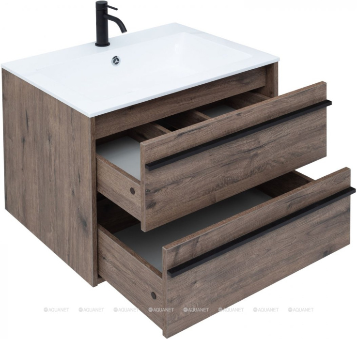 Тумба под раковину Aquanet Lino 70 в цвете "дуб веллингтон" - яркий пример мебели в эко-стиле. Яркая, приятная глазу цветовая гамма плюс текстурная поверхность, максимально приближенная по тактильным ощущениям к натуральной древесной поверхности, является визитной карточкой коллекции.