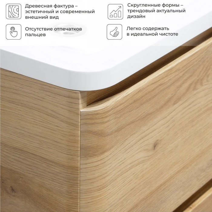 Невероятно органичная по дизайну коллекция Roberto великолепно смотрится в цвете Дуб Мавелла Голд. Эстетика изящества и минимализма - скругленные фасады, умывальник из искусственного камня со скругленными углами. Качественная фурнитура с доводчиками. Плавное и бесшумное закрывание ящиков. Умывальник полностью закрывает корпус тумбы, что обеспечивает дополнительную защиту от воды. Подвесной способ установки тумбы с раковиной дает возможность не только визуально увеличить пространство, но и обеспечивает быстрый и удобный доступ для уборки. Тумба для ванной способна вместить в себя достаточно много вещей. Изысканность, простота и гармоничность - все сошлось в этой прекрасной коллекции!