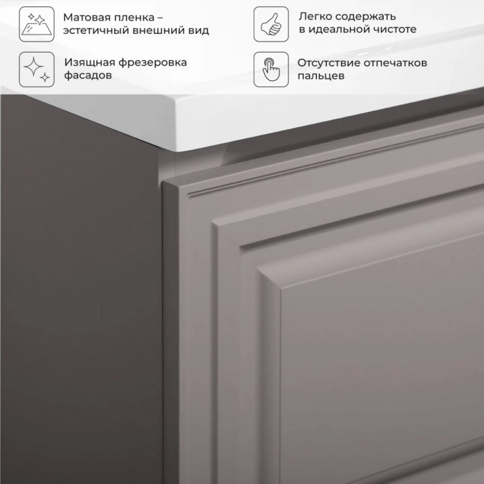 Подвесная тумба с раковиной из коллекции Verona станет настоящим украшением ванной комнаты в современном классическом стиле. Изделие изготовлено из прочного МДФ, поэтому выдерживает высокие эксплуатационные нагрузки. Корпус и фасады покрыты матовой пленкой , что обеспечивает дополнительную защиту мебели от влаги и перепадов температуры. Качественная фурнитура с доводчиками обеспечивает легкое открывание и плавное закрывание ящиков. Подвесной способ установки дает возможность не только визуально увеличить пространство, но и обеспечивает быстрый и удобный доступ для уборки.