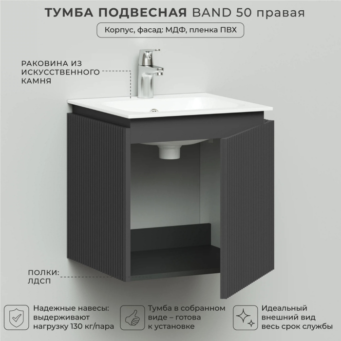 Невероятно органичная по дизайну коллекция BAND великолепно смотрится в цвете Графит. Качественная фурнитура с доводчиками. Плавное и бесшумное закрывание дверей. Подвесной способ установки тумбы с раковиной дает возможность не только визуально увеличить пространство, но и обеспечивает быстрый и удобный доступ для уборки. Тумба для ванной комнаты способна вместить в себя достаточно много вещей. Изысканность, простота и гармоничность - все сошлось в этой прекрасной коллекции!