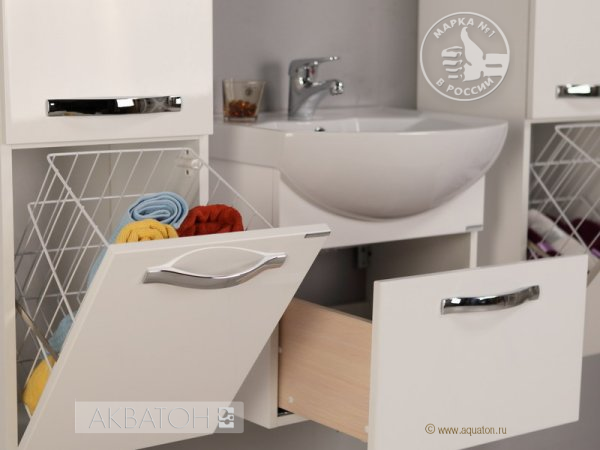 В тумбе за фасадом расположен ящик с системой организации пространства, изготовленный из декоративной влагостойкой ДСП. Ящик установлен на направляющие полного выдвижения немецкого производителя Blum, благодаря чему им удобно пользоваться даже с керамической раковиной, выступающей вперед.